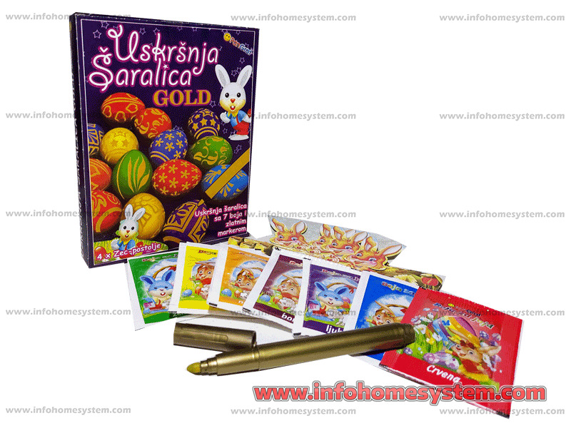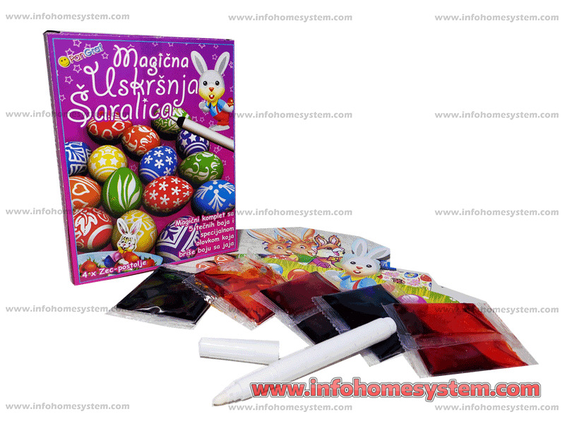 BOJA ZA JAJA SA SARALICOM PANGRAF Materijal proizvoda: Boja: Transportno pakovanje: 20 / 20 Min pakovanje: 1 Opis pakovanja:17x13x2cm Opis proizvoda: 7 boja za jaja, 4 drzaca zeka i zlatni marker Sifra: 83326 Slični proizvodi